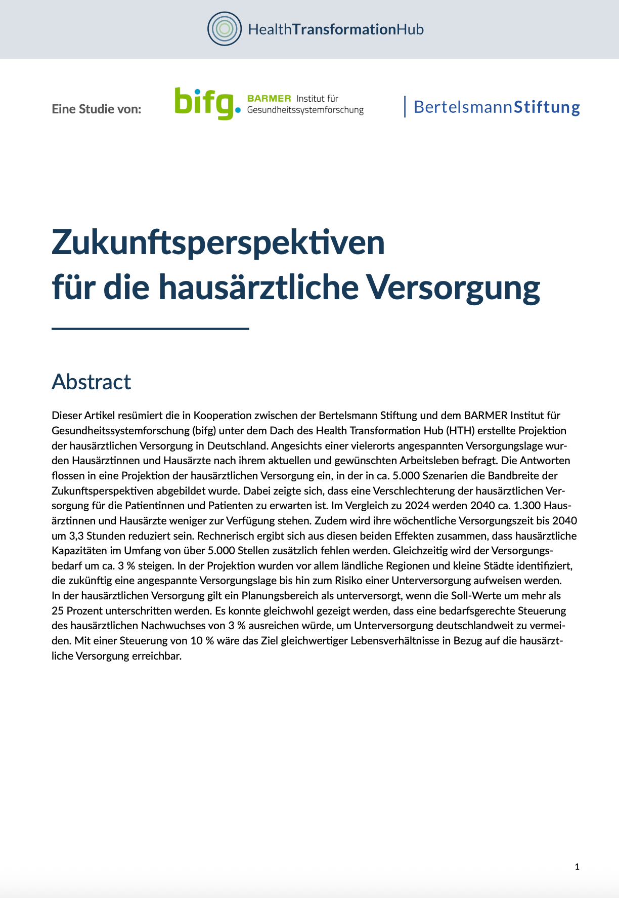 Der Health Transformation Hub (HTH) ist eine Kooperation der Bertelsmann Stiftung und BSt Gesundheit gGmbH. Die BSt Gesundheit gGmbH ist eine hundertprozentige Tochterfirma der Bertelsmann Stiftung.